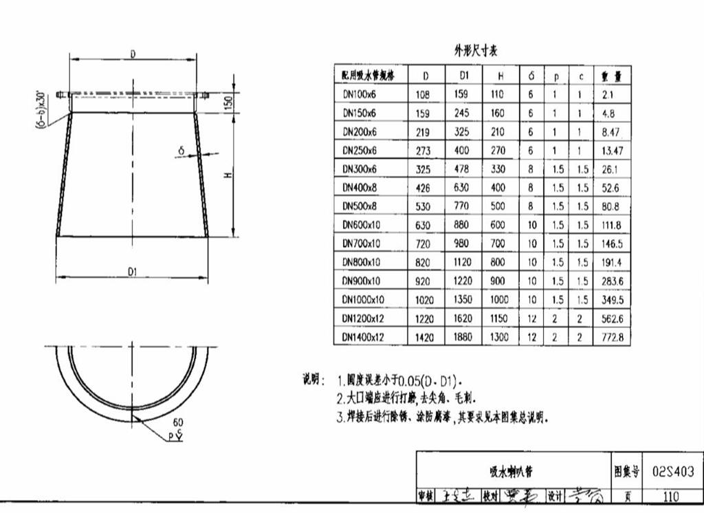 只不過它是有斜度的直上直下的那么一種變徑。而不是像我們正常的異徑管大小頭一樣,它都是緩慢的,有一個坡度那樣的緩緩的變出來的,你如果從下面往上看,它就是一條線的。那樣的比直。只不過這樣的一個用中板卷制成功的形式的直邊異徑管,在這個建筑圖集上被叫做吸水喇叭口。http://www.gomas.cn