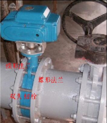 接下來的這個圖片就是對夾蝶閥的一個安裝示意圖。這上面很明白的產品顯示了安裝部分,應該處于的位置。有螺栓也有管道,管子焊在法蘭上,法蘭中間夾著的蝶閥,然后是用雙頭螺栓連接在一起。也有就是使用單頭的六角螺栓來進行安裝的。其實作用也是一樣的。當然這兒說的是對夾式的產品,如果是產品本身自帶法蘭的,是叫做341這樣的一種連接方式,如果看到這樣的一種連接方式,不管他是橡膠密封的或者是金屬硬密封的蝶閥產品。都是配相應的壓力的普通法蘭產品就可以了。圖片中所展示的這個閥門兒叫做電動蝶閥這是說他的驅動方式。有手柄進行。驅動的,也有渦輪驅動的。這個則是遠程的。來操縱它上面的電動裝置來進行打開或者關閉的一種蝶閥產品。這樣的閥門在進行操作時,不用到到現場就行的。電路連接到了閥門上,在控制室里面就能時間閥門的開啟和關閉了。如果和是否采用蝶形法蘭產品在下面的章節中有說明。